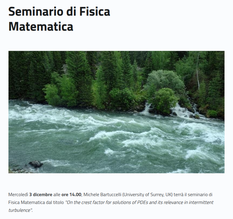 Michele Bartuccelli visited the University of Rome III yesterday (Wednesday 3 December) and gave a talk in the Seminario di Fisica Matematica (seminar webpage here). The title of his talk was “On the crest factor for solutions of PDEs and its relevance in intermittent turbulence.” It was based on joint work with Guido Gentile. In